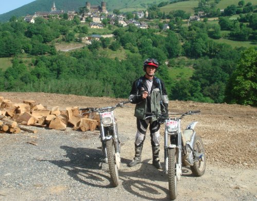 Nous avions bien fait de quitter Marseille assez tôt car c’etait sans compter les arrêts aux péages de Fred et Dom qui pouvaient bien durer 10-15 min, et ce à tous les péages… sans compter que le Land Rover de Fred qui affiche les 20 ans et 600 000 kms n’est pas un foudre de guerre mais est tout à fait assorti avec sa vieille Yam 250 TY. Quelques petits détours non loin de Séverac et au moins 5h plus tard, nous arrivions à la capitale européenne du trial, du moins pour ce WE, à savoir St Geniez d’Olt. Après avoir klaxonné Corinne et Bruno Dumand (les ambulanciers), récupéré notre rouleau de PQ au camping (ce détail aura son importance plus tard…), on file rejoindre avec empressement tous les bénévoles habituels du Moto Club 12 autour du maestro Molino.